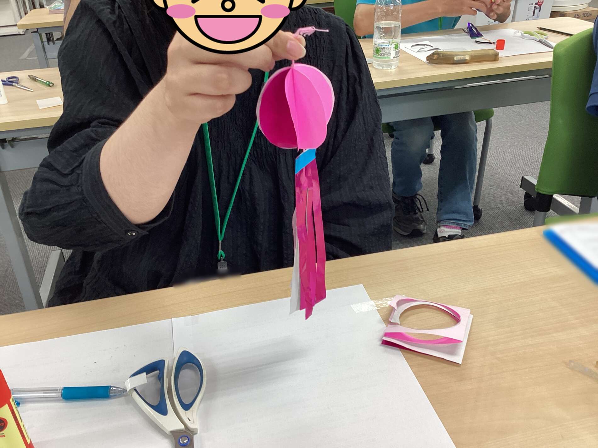 吹き流しの飾りに挑戦し、色とりどりの紙を使って皆さん思い思いの作品を仕上げていきました。教えあったりする場面も見られ、和やかな雰囲気のなか、素敵な七夕飾りが完成しました。