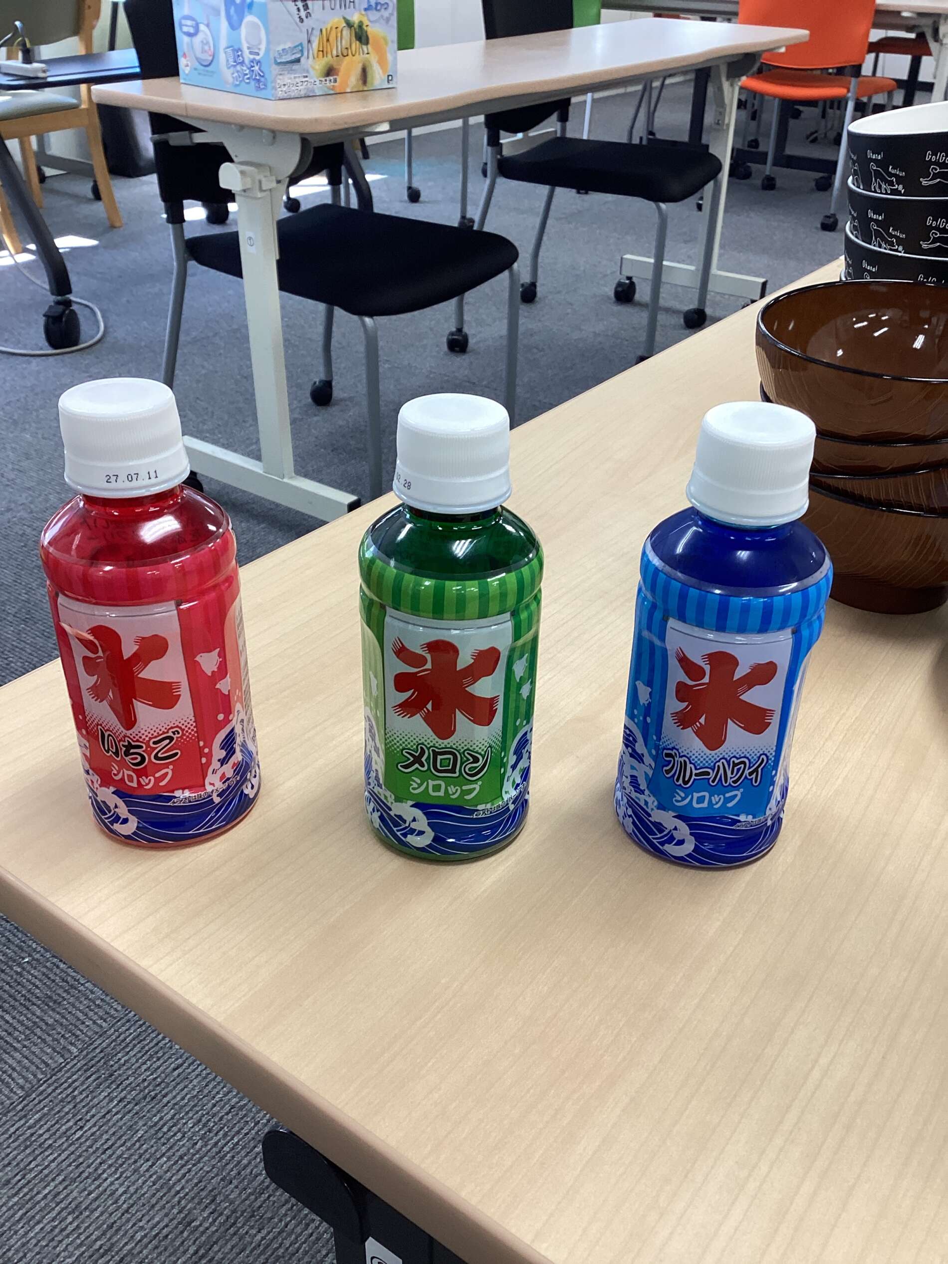最後はかき氷です!かき氷機で削ったふわふわの氷に、いちご、メロン、ブルーハワイの3種類のシロップをかけて、涼しい夏の味を堪能しました。
