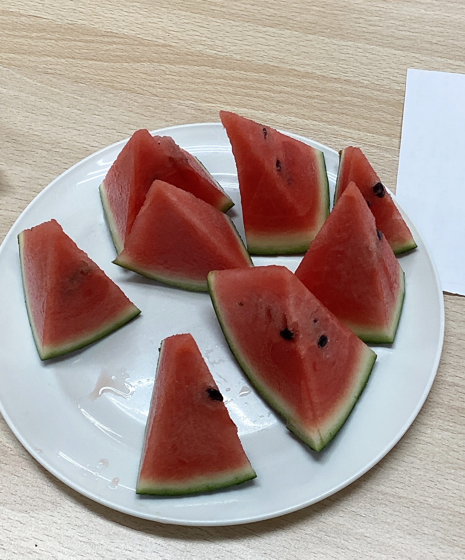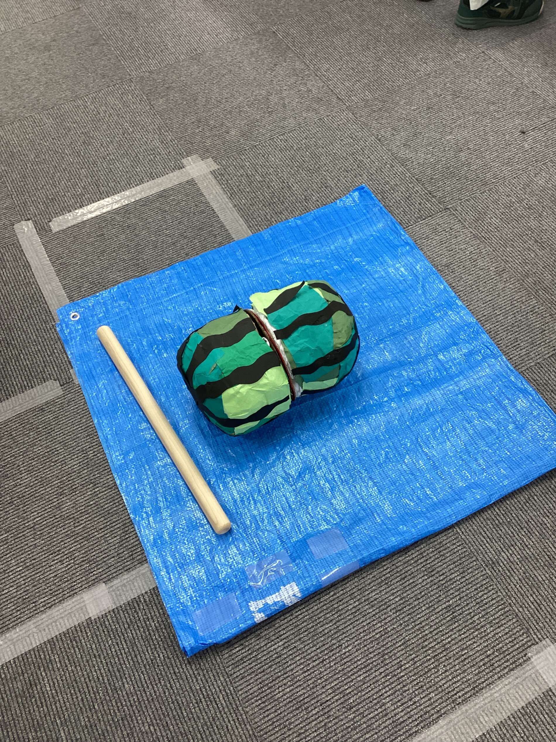 次はスイカ割りです!本物そっくりのダミーのスイカを使って、目隠しをした参加者が棒でスイカを探します。周りの仲間が「もっと右!」「そのまままっすぐ!」と声をかけ、会場は笑い声でいっぱいになりました。ゲームの後は、用意していた甘いスイカをみんなで美味しくいただきました。