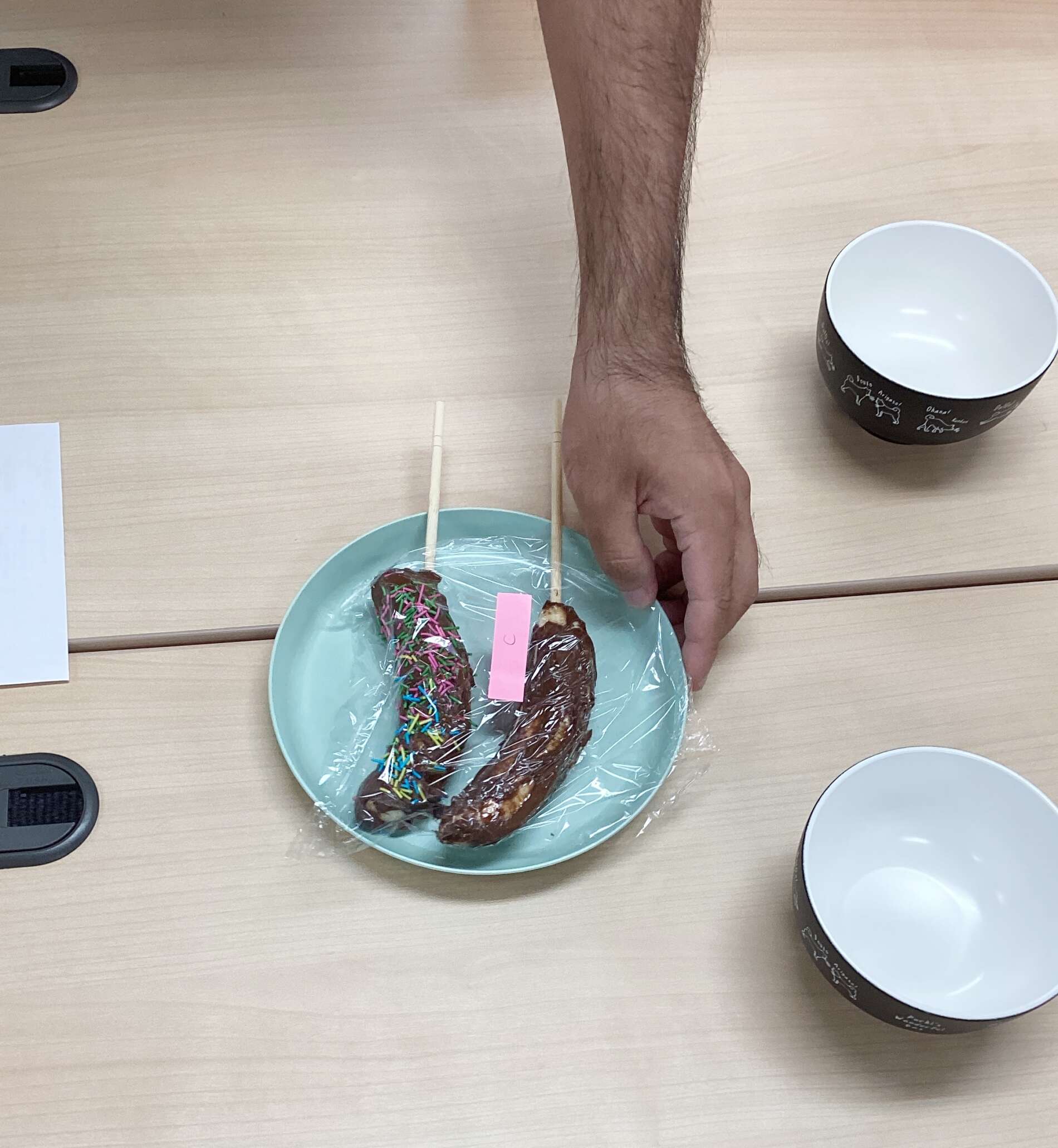 まずはチョコバナナづくり!板チョコを湯煎して溶かし、バナナにたっぷりコーティング。みんなでデコレーションも楽しみ、自分だけのオリジナルチョコバナナを作りました。