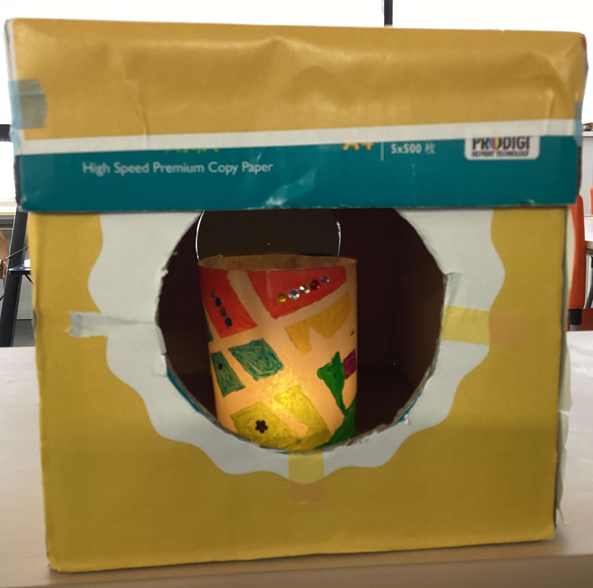主役は、それぞれが持ち寄った『お月見ランタン』です。部屋の明かりを落とし、ランタンを暗い箱の中にセットしました。
