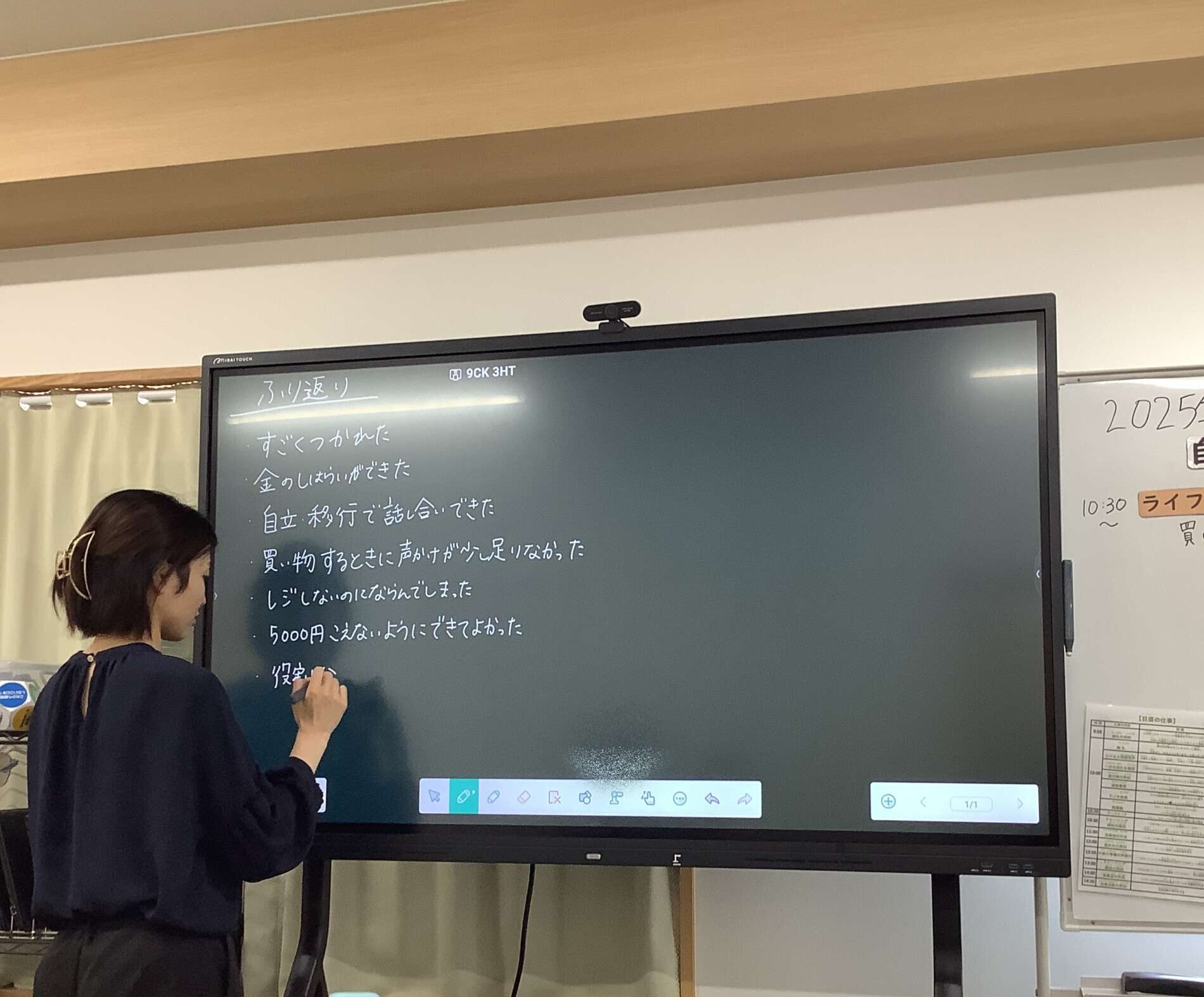 事業所に戻ってきてからは「企画運営をしてみよう」から「買い物」までの取り組みについて振り返りをしました