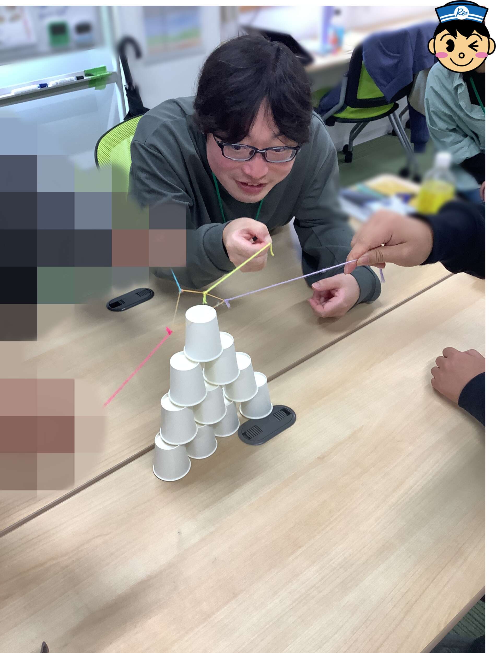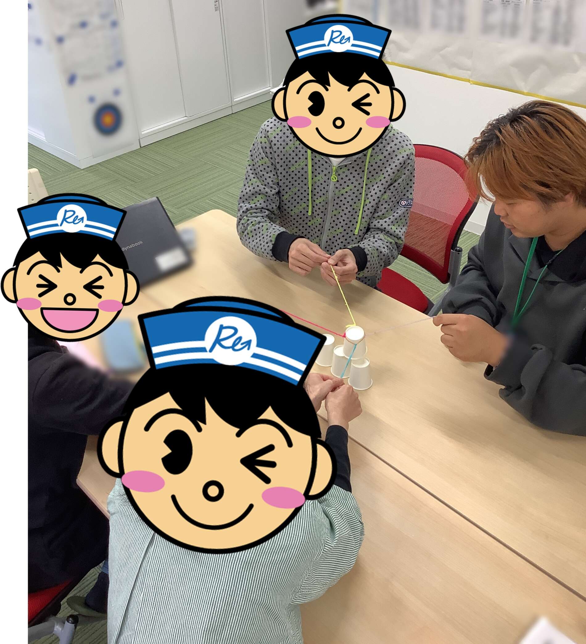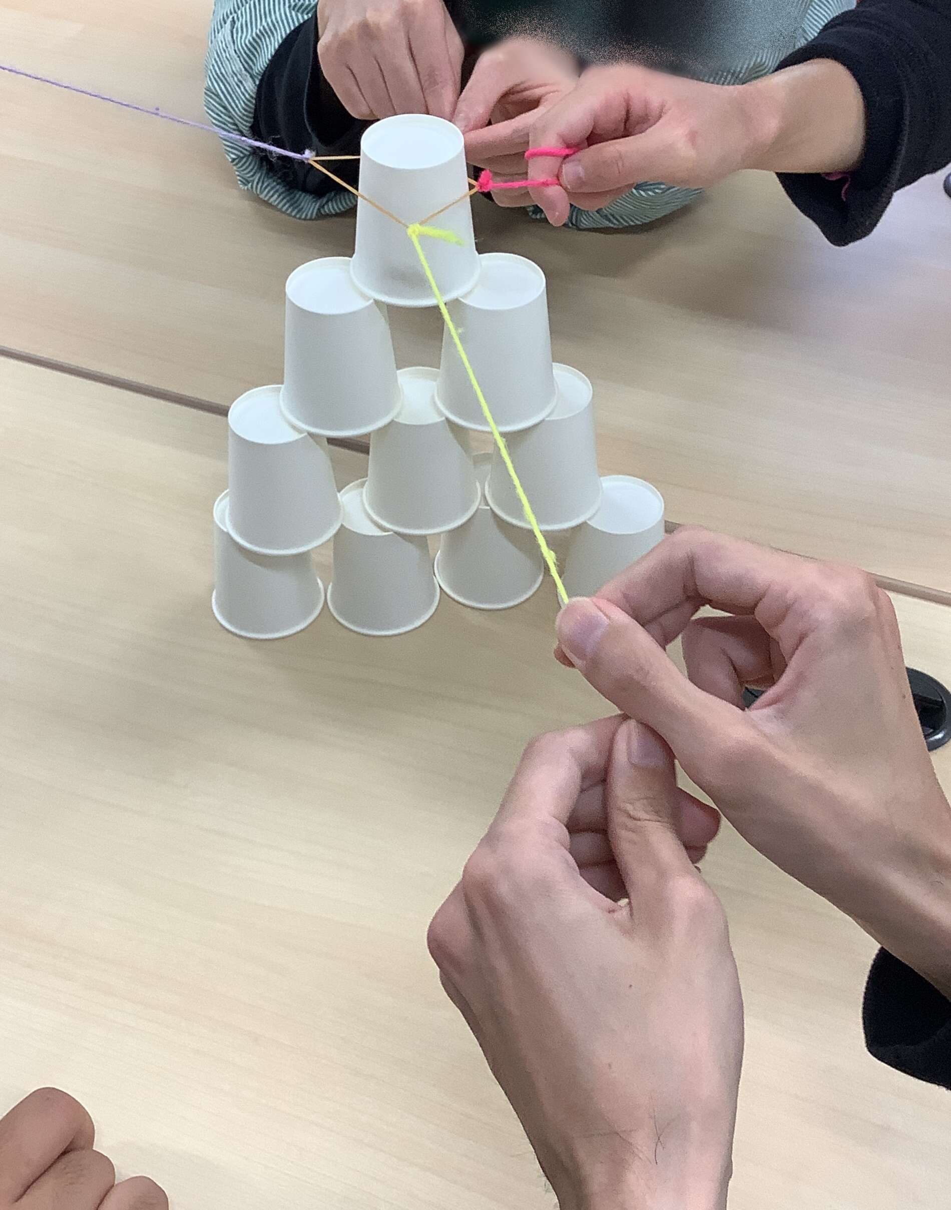 4人グループになり、協力しながら、手を使わずに紙コップのタワーを組み立てていきます
