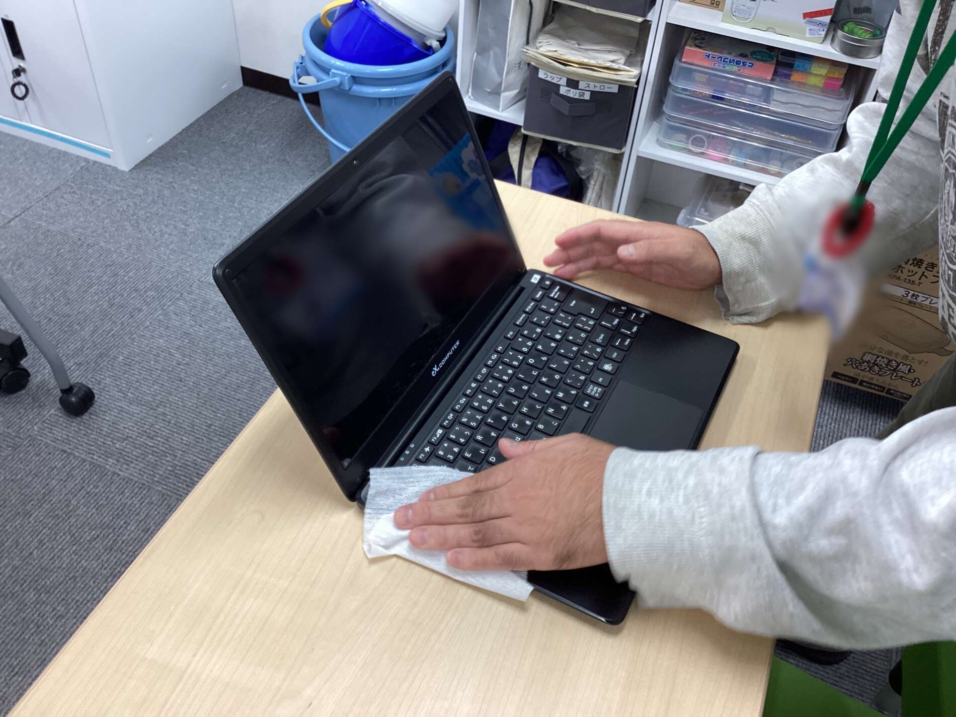クルーの皆さんで分担し、まずは毎日使っているPCなどの備品を丁寧に磨き上げました。さらに、窓のサッシやドアの裏など、日ごろ手が届かない箇所も入念に!「ここも汚れてる!」「見て、ピカピカになったよ!」と声を掛け合いながら、隅々まで磨き上げてくれました。自分たちが使う場所を綺麗にすることで、清々しい気持ちで週末を迎えることができました!