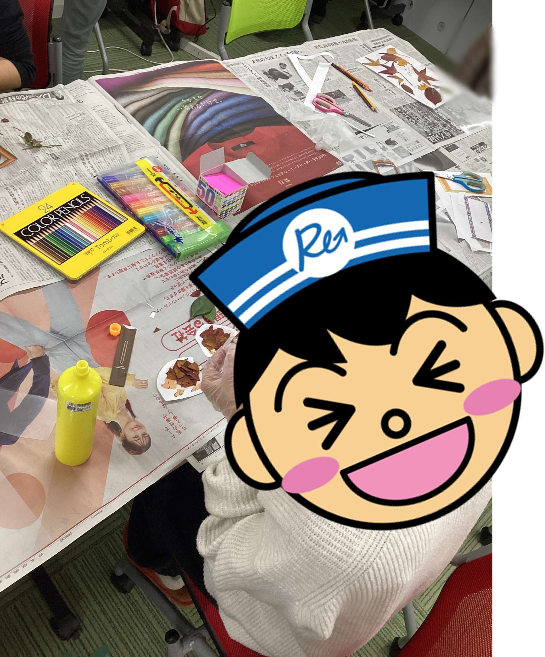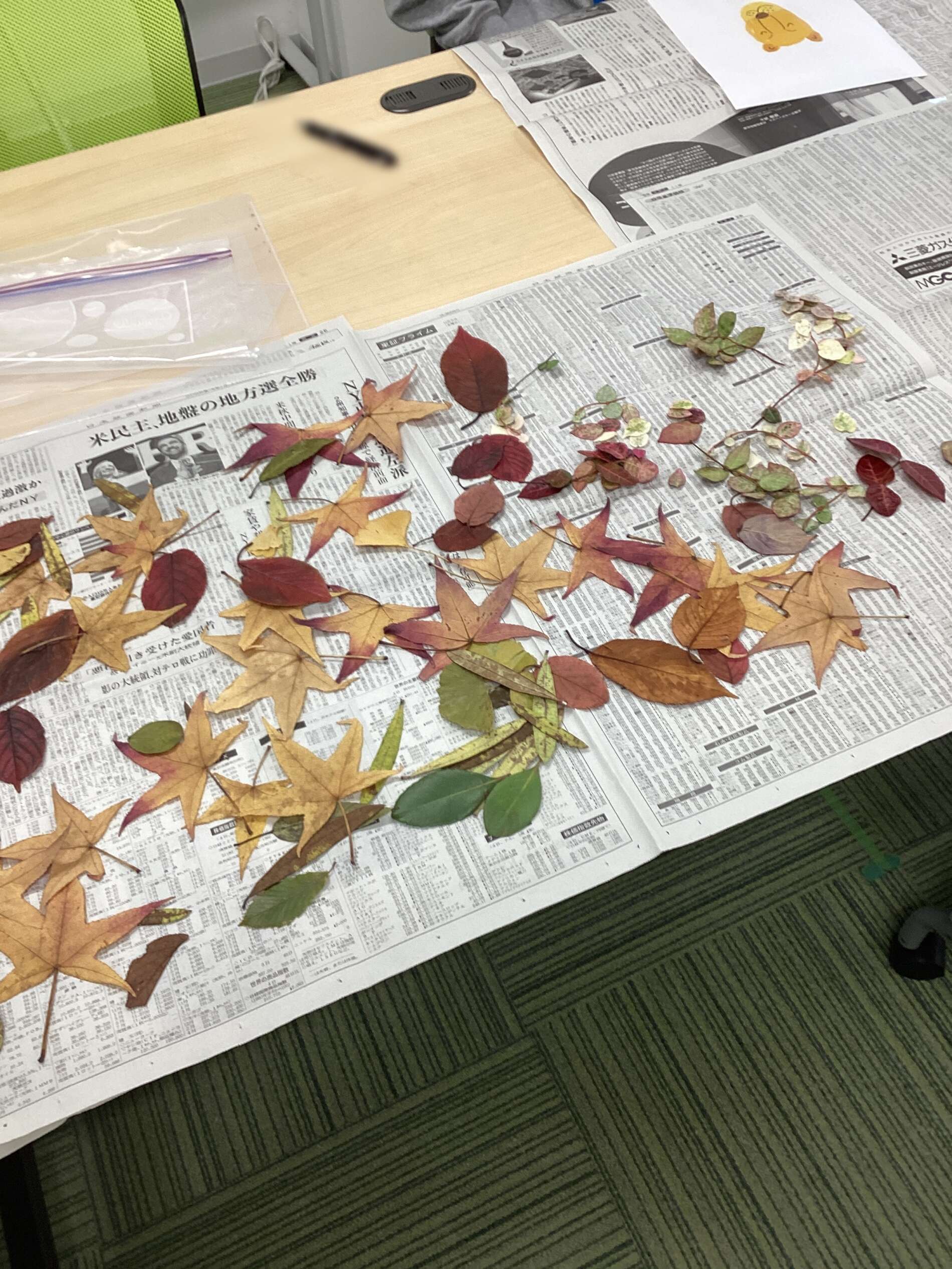 秋の葉を使い、ハサミやノリなどを使って秋の飾りを作成しました😊