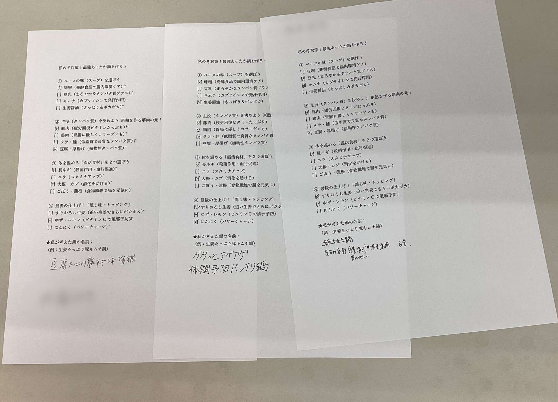 講座の締めくくりには、個人ワークとして「オリジナル最強あったか鍋レシピ」を考案🍲