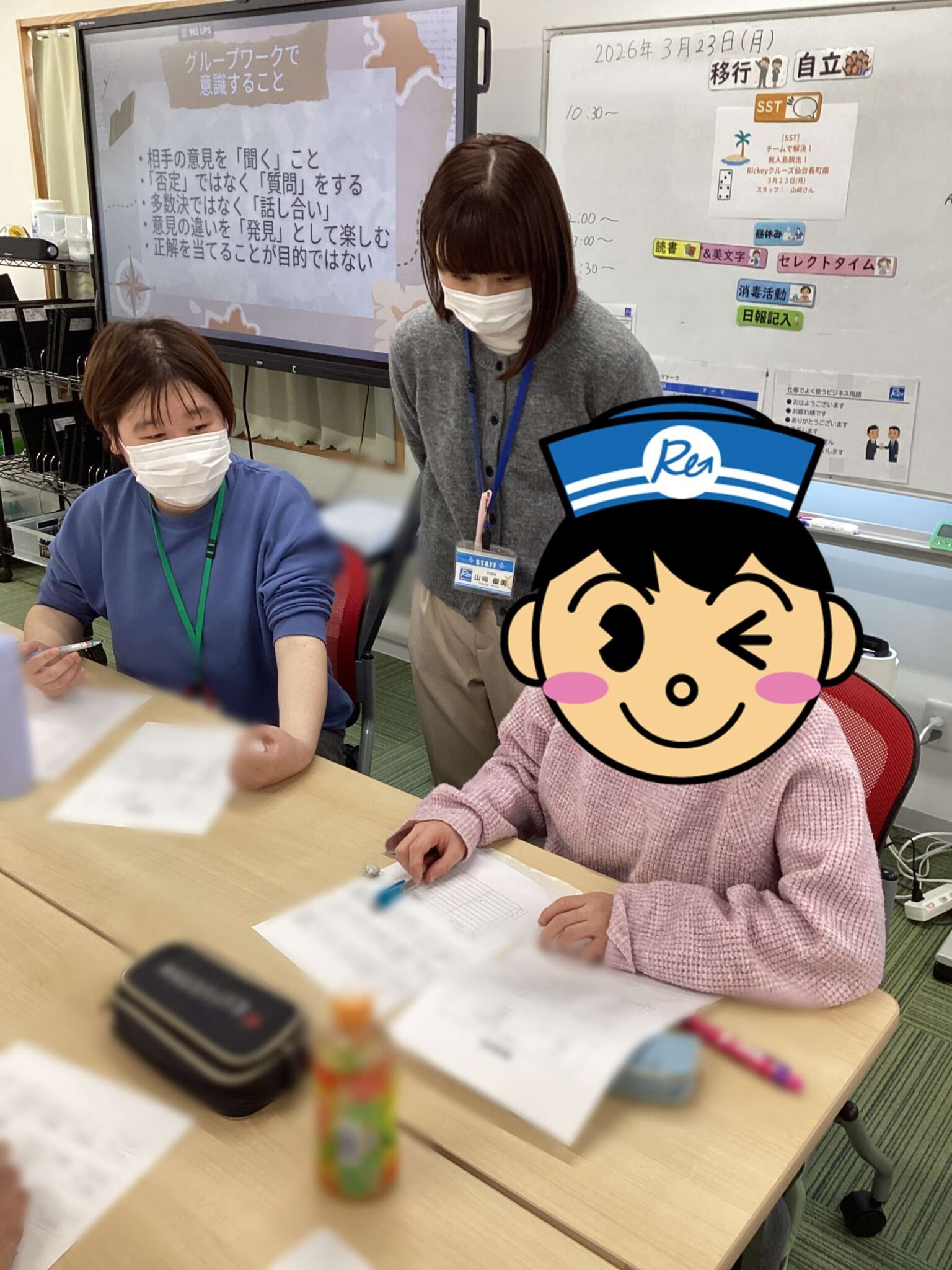 自立訓練(生活訓練)では対人関係で欠かせない「距離感」についてグループワークを行いました。