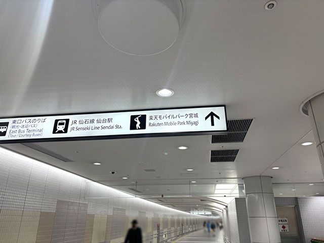 階段またはエレベーターを使用して下に降りたら、案内看板の楽天モバイルパーク宮城方面に進みます。