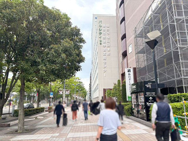 交差点を渡り終えると「パルシティ仙台」と書かれた白い建物が見えてきます。