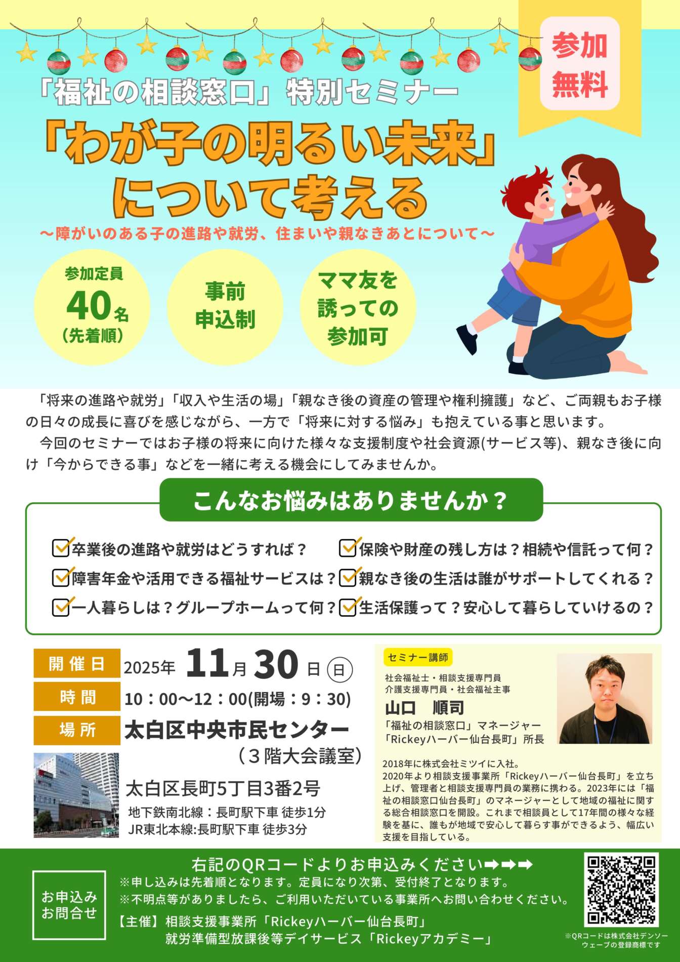 令和7年11月30日㈰に太白区中央市民センターにおいて、RickeyアカデミーとRickeyハーバーの共催による特別セミナー 『わが子の明るい未来について考える』 ~障がいのある子の進路や就労、住まいや親なきあとについて…