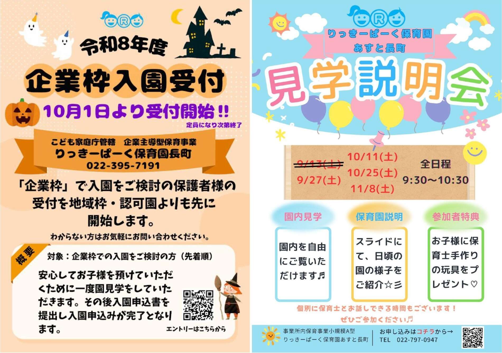 こんにちは🎵 地域の皆様に、りっきーぱーく保育園長町・あすと長町からのお知らせです! りっきーぱーく保育園あすと長町では、現在受付を開始しております。 また、りっきーぱーく保育園長町では10月1日より受付…